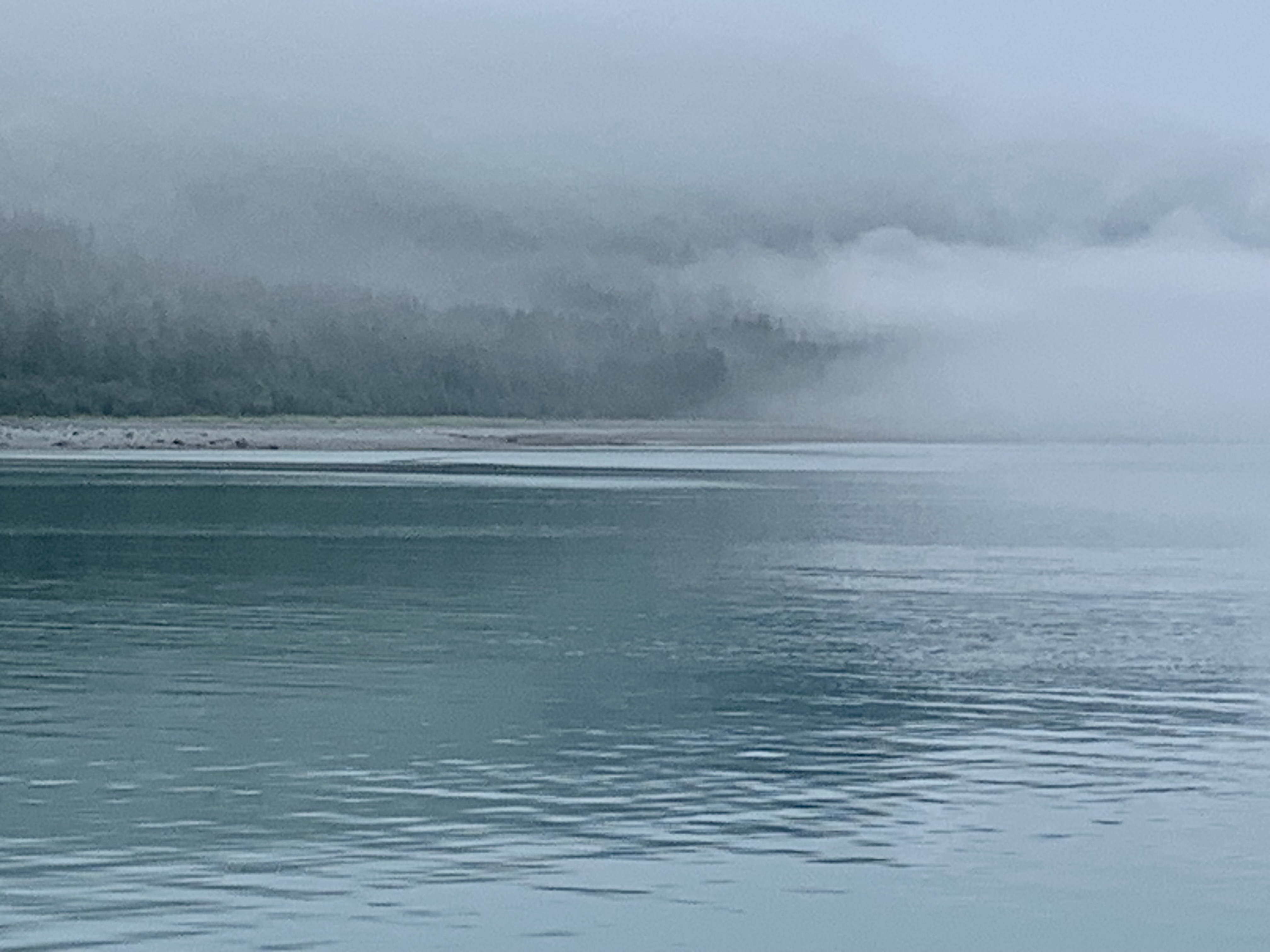 The Glacier Bay Lodge is beautifully sited. Hiking trails lead from the lodge along the bay and into the woods. This was departure day and what a shock it was to awaken, part the curtains, and see a sky, though still mostly cloudy, in which I spotted a couple of blue openings… so I determined I would attempt the remainder of the various hikes near the lodge, which included the Forrest Trail and Beach Trail. After the fiasco of the Bartlett River Trail the previous day, I did not want to venture too far off from seeking DRY shelter., even if it was to pop into a strangers tent in the campground. I was totally over getting soaked.
